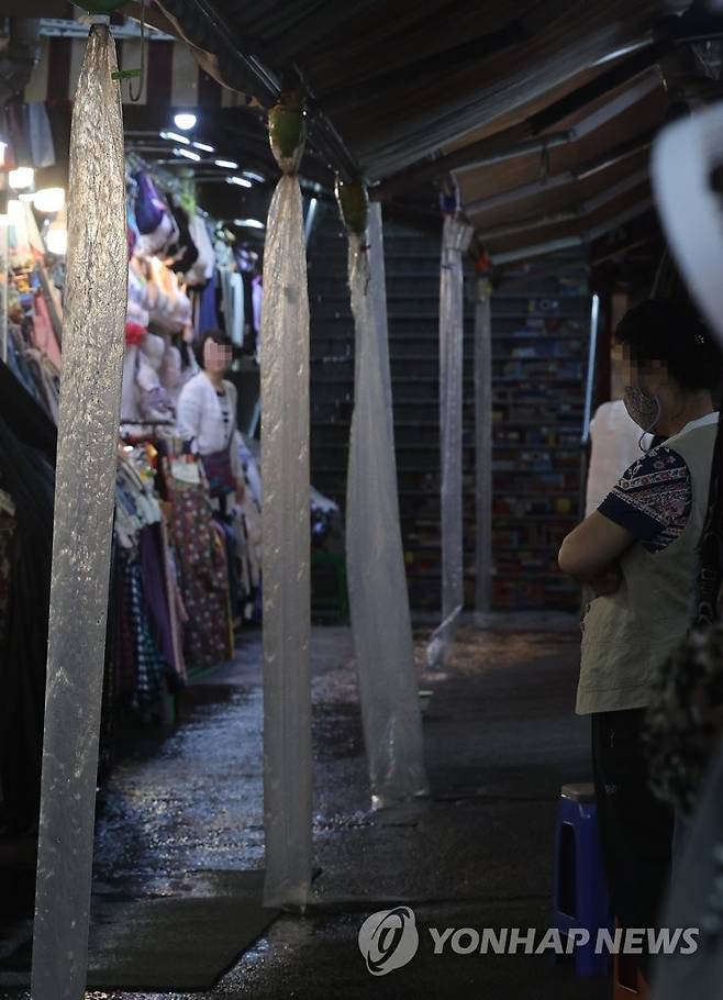 (서울=연합뉴스) 박동주 기자 = 장맛비가 계속된 30일 서울 남대문 시장에 천막 사이로 떨어지는 빗물을 받아내는 물주머니가 설치되어 있다.