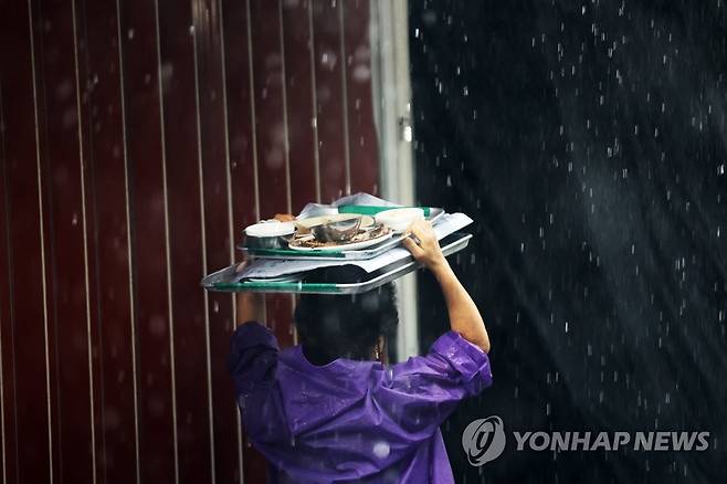 (서울=연합뉴스) 박동주 기자 = 장맛비가 계속된 30일 서울 남대문 시장에서 한 상인이 그릇을 옮기고 있다.