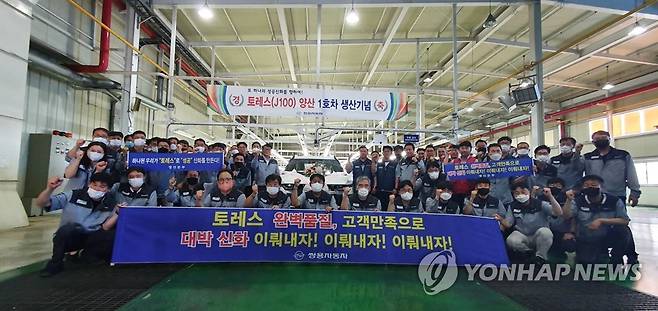 (서울=연합뉴스) 쌍용자동차가 토레스의 본격적인 출시를 앞두고 30일 경기도 평택공장에서 양산 1호차 기념행사를 했다고 밝혔다. 사진은 양산 1호차 기념행사에서 기념 촬영하는 쌍용자동차 임직원들. 2022.6.30 [쌍용자동차 제공. 재판매 및 DB 금지]