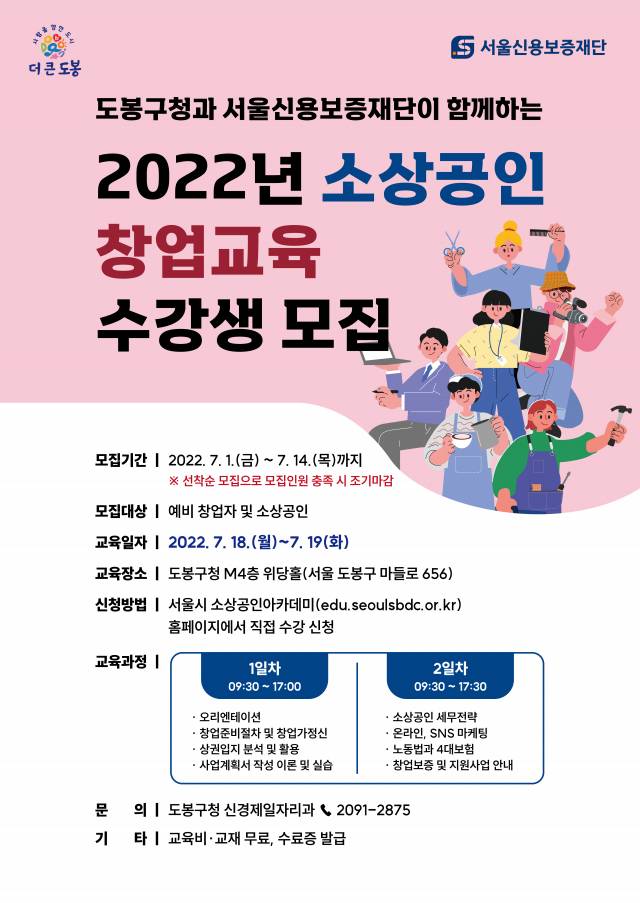서울 도봉구가 서울신용보증재단과 공동 주최하는 '2022년 소상공인 창업 교육' 과정 참가 신청을 7월 1일부터 14일까지 접수한다.