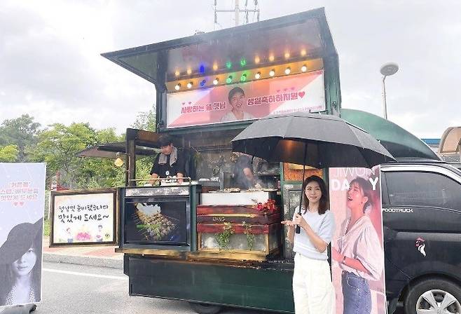 공개된 사진엔 간식차 앞에서 포즈를 취한 하지원의 모습이 담겼다. 이 간식차는 하지원의 생일 기념으로 준비된 것이다.