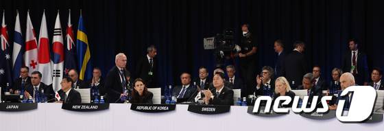 (마드리드=뉴스1) 오대일 기자 = 윤석열 대통령이 29일 오후(현지시간) 스페인 마드리드 이페마(IFEMA) 국제회의장에서 열린 나토(NATO·북대서양조약기구) 동맹국·파트너국 정상회의에 참석해 박수치고 있다. (대통령실사진기자단) 2022.6.30/뉴스1