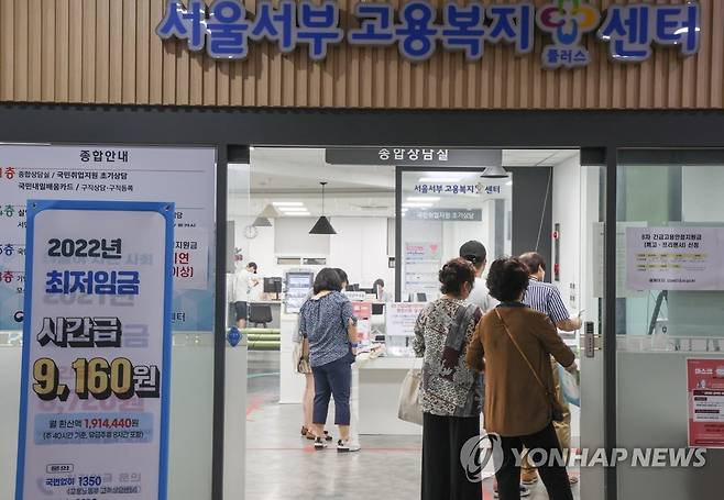 (서울=연합뉴스) 류효림 기자 = 내년도 최저임금이 올해보다 5.0% 오른 시간당 9천620원으로 정해졌다. 최저임금을 심의·의결하는 사회적 대화 기구인 최저임금위원회는 지난 29일 정부세종청사에서 제8차 전원회의를 열어 내년도 최저임금을 9천620원으로 의결했다.이는 올해 최저임금(9천160원)보다 460원(5.0%) 높은 금액이다. 내년도 최저임금의 월 환산액(월 노동시간 209시간 기준)은 201만580원이다. 사진은 30일 서울 마포구 서부고용복지플러스센터에 설치된 올해 최저임금 안내문 모습. 2022.6.30