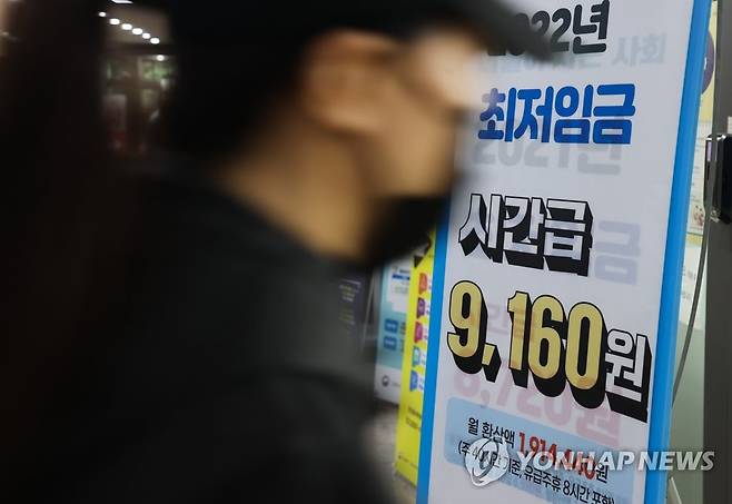 (서울=연합뉴스) 류효림 기자 = 내년도 최저임금이 올해보다 5.0% 오른 시간당 9천620원으로 정해졌다. 최저임금을 심의·의결하는 사회적 대화 기구인 최저임금위원회는 지난 29일 정부세종청사에서 제8차 전원회의를 열어 내년도 최저임금을 9천620원으로 의결했다.이는 올해 최저임금(9천160원)보다 460원(5.0%) 높은 금액이다. 내년도 최저임금의 월 환산액(월 노동시간 209시간 기준)은 201만580원이다. 사진은 30일 서울 마포구 서부고용복지플러스센터에 설치된 올해 최저임금 안내문 모습. 2022.6.30