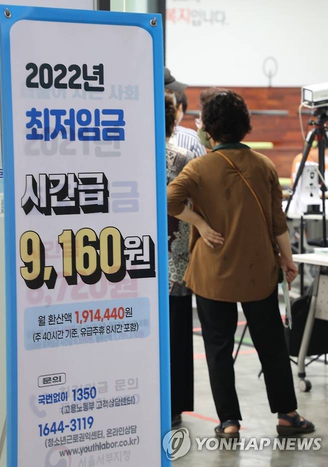 (서울=연합뉴스) 류효림 기자 = 내년도 최저임금이 올해보다 5.0% 오른 시간당 9천620원으로 정해졌다. 최저임금을 심의·의결하는 사회적 대화 기구인 최저임금위원회는 지난 29일 정부세종청사에서 제8차 전원회의를 열어 내년도 최저임금을 9천620원으로 의결했다.이는 올해 최저임금(9천160원)보다 460원(5.0%) 높은 금액이다. 내년도 최저임금의 월 환산액(월 노동시간 209시간 기준)은 201만580원이다. 사진은 30일 서울 마포구 서부고용복지플러스센터에 설치된 올해 최저임금 안내문 모습. 2022.6.30