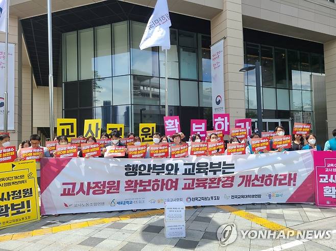 (서울=연합뉴스) 교사노동조합연맹을 비롯한 교원단체가 30일 정부세종청사 행정안전부 제1별관 앞에서 '교원 정원 확보를 위한 교원단체예비교사 공동 기자회견'을 하고 있다. 2022.6.30 [교사노동조합연맹 제공. 재판매 및 DB 금지]