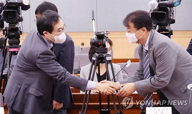 (서울=연합뉴스) 김승두 기자 = 이도훈 외교부 2차관(왼쪽)과 방기선 기재부 1차관이 30일 정부서울청사에서 열린 제42차 국제개발협력위원회에 참석해 인사하고 있다. 2022.6.30