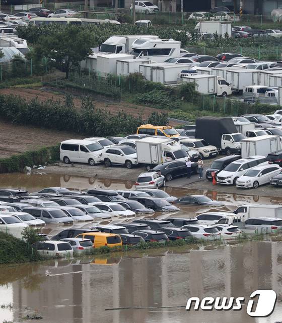 (수원=뉴스1) 김영운 기자 = 30일 오후 경기 수원시 권선구의 한 중고차 매매단지에 기습적으로 내린 폭우로 인해 미처 나오지 못한 중고차량들이 물에 잠겨있다. 2022.6.30/뉴스1