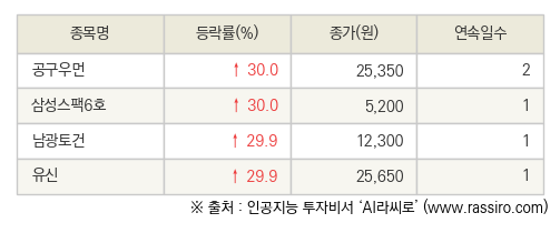 30일 공구우먼(366030), 삼성스팩6호(425290), 남광토건(001260), 유신(054930)등이 상한가를 기록했다. 특히 공구우먼은 전 거래일 대비 30.0% 오른 25,350원에 거래를 마감하며 높은 관심을 받았다.