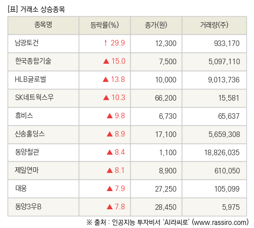상승한 종목으로 남광토건(001260) 29.9%, 한국종합기술(023350) 15.0%, HLB글로벌(003580) 13.8% 등이 있다.