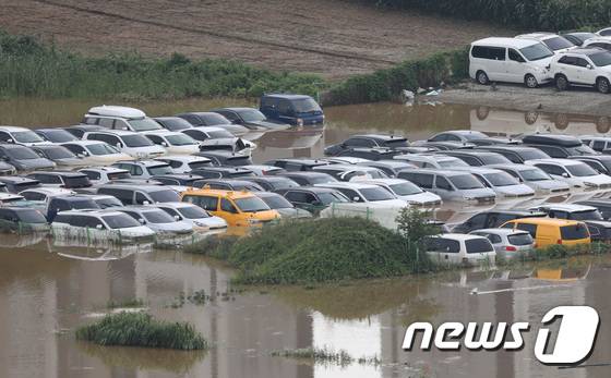 (수원=뉴스1) 김영운 기자 = 30일 오후 경기 수원시 권선구의 한 중고차 매매단지에 기습적으로 내린 폭우로 인해 미처 나오지 못한 중고차량들이 물에 잠겨있다. 2022.6.30/뉴스1