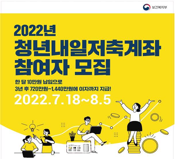 보건복지부는 경제적으로 어려운 청년이 목돈을 마련해 든든하게 사회생활을 출발할 수 있도록 지원하기 위해 청년내일저축계좌를 도입해 7월 18일부터 8월 5일까지 신청을 받는다고 30일 밝혔다.