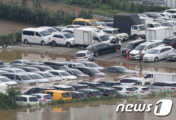 (수원=뉴스1) 김영운 기자 = 30일 오후 경기 수원시 권선구의 한 중고차 매매단지에 기습적으로 내린 폭우로 인해 미처 나오지 못한 중고차량들이 물에 잠겨있다. 2022.6.30/뉴스1