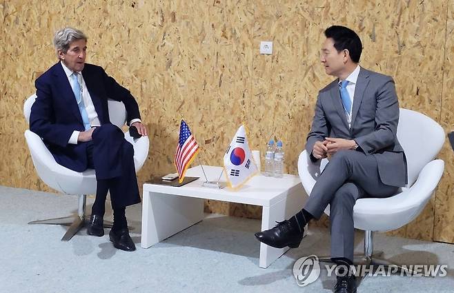 사진은 존 케리 미국 기후특사(왼쪽)와 양자 면담하는 장성민 대통령실 정책조정기획관.