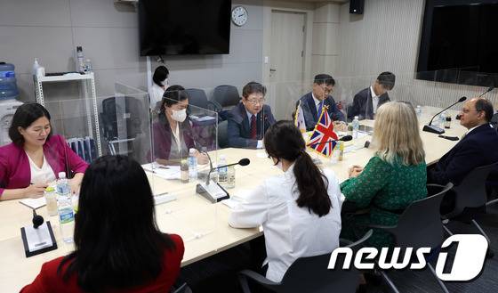 (서울=뉴스1) = 박보균 문화체육관광부 장관이 30일 서울 용산구 문체부 저작권보호과 서울사무소 회의실에서 해리엇 볼드윈 영국 의회 국제의회연맹 그룹 회장을 비롯한 영국 의원 방한단과 양국의 문화, 관광 교류 증진 협력 방안을 논의하고 있다. (문화체육관광부 제공) 2022.6.30/뉴스1