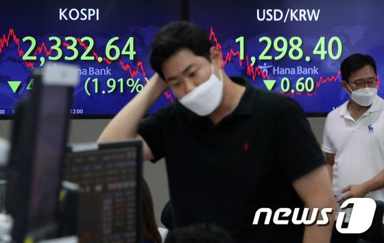 (서울=뉴스1) 이동해 기자 = 11일 서울 중구 하나은행 명동점 딜링룸 전광판에 코스피 지수가 전 거래일보다 45.35포인트(1.91%) 내린 2332.64을 원/달러 환율은 전 거래일보다 0.6원 내른 1298.4원을 나타내고 있다. 코스닥은 전 거래일보다 16.91포인트(2.22%) 내린 745.44에 거래를 마쳤다. 2022.6.30/뉴스1