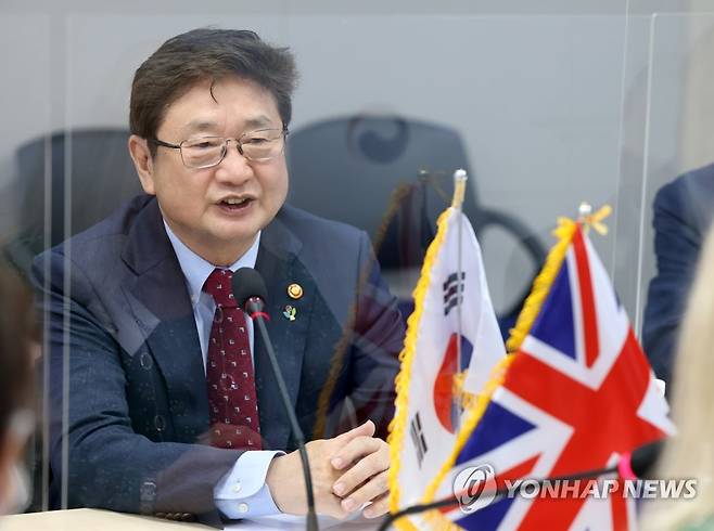 (서울=연합뉴스) 박보균 문화체육관광부 장관이 30일 서울 용산구 문체부 저작권보호과 서울사무소 회의실에서 해리엇 볼드윈 영국 의회 국제의회연맹 그룹 회장을 비롯한 영국 의원 방한단과 면담하고 있다. 2022.6.30 [문화체육관광부 제공. 재판매 및 DB 금지]