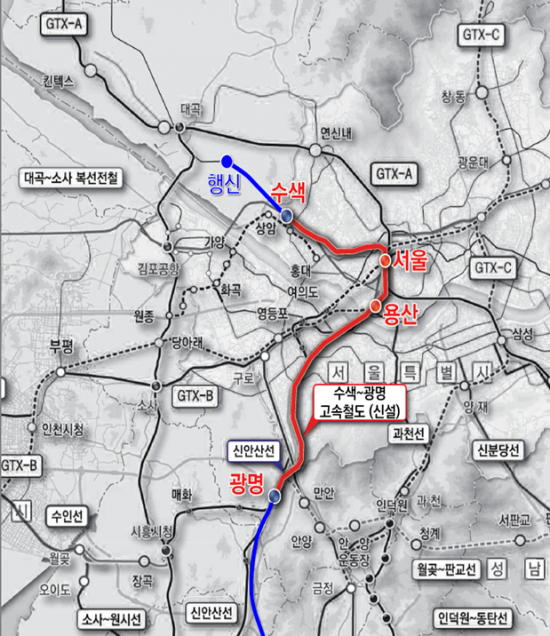 먼저 수색~광명 고속철도 건설사업은 광명에서 용산, 서울역을 거쳐 수색차량기지까지 총 23.6km 구간의 고속철도 전용선을 지하에 건설하는 사업이다. 총 사업비는 2조4823억원이다. 국토교통부는 올해 하반기 기본계획 수립에 착수해 내년부터 기본, 실시설계를 거쳐 2025년에 착공할 계획이다.