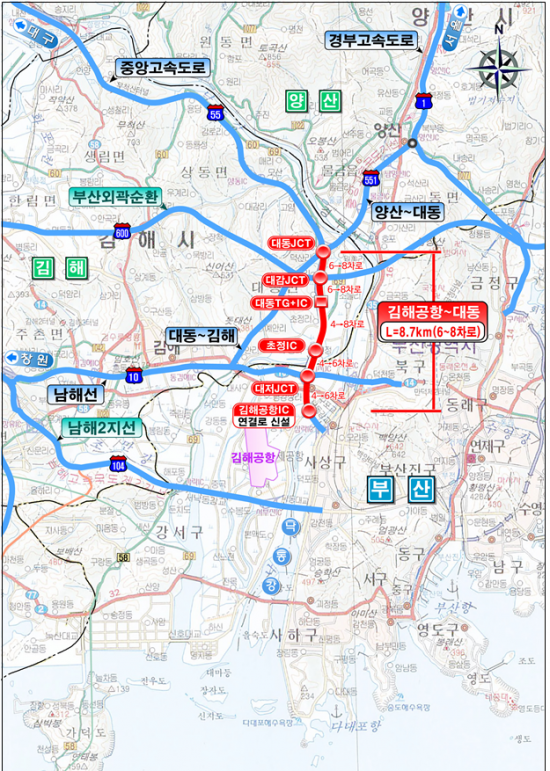 이외에도 중앙고속도로 김해공항~대동 구간 확장사업도 예비타당성조사를 통과했다. 김해공항∼대동 구간은 출퇴근 시간 교통량이 상시 도로 용량을 초과해 도로 서비스 수준이 매우 낮으며(D~F 수준), 화물차의 비율도 높아 낮 시간에도 정체로 인한 불편이 지속되는 구간이다. 지난해 기준 교통량은 최대 1일 11만3428대이며, 이 중 화물 통행은 1일 4만889대에 이른다.
