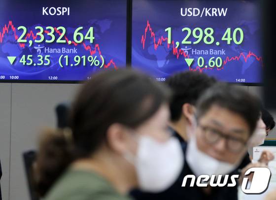 (서울=뉴스1) 이동해 기자 = 11일 서울 중구 하나은행 명동점 딜링룸 전광판에 코스피 지수가 전 거래일보다 45.35포인트(1.91%) 내린 2332.64을 나타내고 있다. 코스닥은 전 거래일보다 16.91포인트(2.22%) 내린 745.44로 원/달러 환율은 전 거래일보다 0.6원 내른 1298.4원에 거래를 마쳤다. 2022.6.3/뉴스1