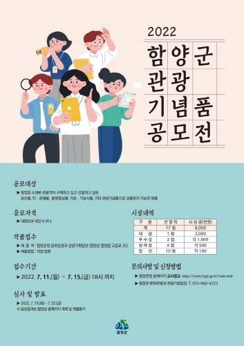 군 관계자는 "이번 공모전으로 아이디어 넘치는 우수 관광기념품을 발굴해 함양 브랜드 향상 및 관광 경쟁력을 강화하고자 한다. 함양 고유의 특성을 담아 많은 분이 신청하시길 바란다"고 전했다.