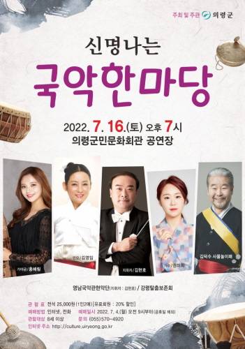 경남 의령군(군수 오태완)은 내달 16일 저녁 7시 의령군민문화회관 공연장에서 국악 명창 '김영임'과 사물놀이의 창시자 '김덕수' 명인이 출연하는 '신명나는 국악 한마당'이 열린다고 밝혔다.