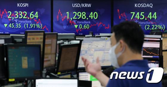 (서울=뉴스1) 이동해 기자 = 11일 서울 중구 하나은행 명동점 딜링룸 전광판에 코스피 지수가 전 거래일보다 45.35포인트(1.91%) 내린 2332.64을 나타내고 있다. 코스닥은 전 거래일보다 16.91포인트(2.22%) 내린 745.44로 원/달러 환율은 전 거래일보다 0.6원 내른 1298.4원에 거래를 마쳤다. 2022.6.3/뉴스1