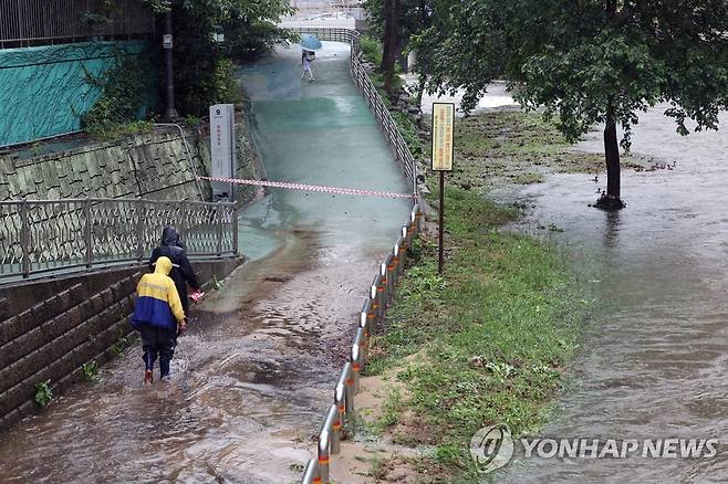 (서울=연합뉴스) 박동주 기자 = 30일 하천수위 상승으로 출입이 통제된 서울 홍제천 산책로에서 우산을 쓴 한 시민이 발길을 돌리고 있다.