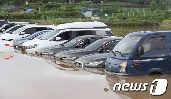 (수원=뉴스1) 김영운 기자 = 30일 오후 경기 수원시 권선구의 한 중고차 매매단지에 기습적으로 내린 폭우로 인해 미처 나오지 못한 중고차량들이 물에 잠겨있다. 2022.6.30/뉴스1