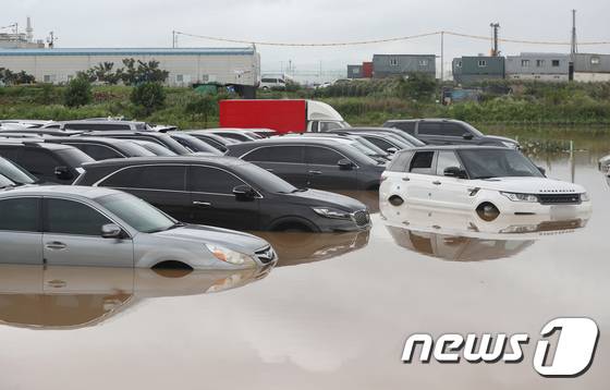 (수원=뉴스1) 김영운 기자 = 30일 오후 경기 수원시 권선구의 한 중고차 매매단지에 기습적으로 내린 폭우로 인해 미처 나오지 못한 중고차량들이 물에 잠겨있다. 2022.6.30/뉴스1