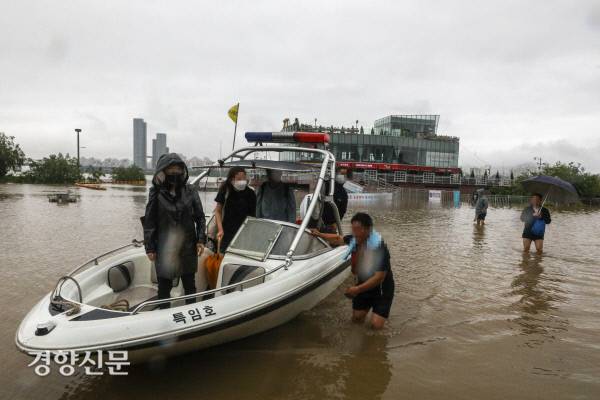 서울전역에 호우경보가 내려진 30일 서울 반포한강공원 서래나루 반포조종면허시험장에서 교육생들이 한강 범람으로 공원에 물이 차오르자 보트에 올라 공원 밖으로 이동하고 있다.