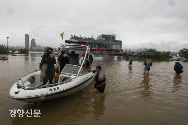 서울전역에 호우경보가 내려진 30일 서울 반포한강공원 서래나루 반포조종면허시험장에서 교육생들이 한강 범람으로 공원에 물이 차오르자 보트에 올라 공원 밖으로 이동하고 있다.