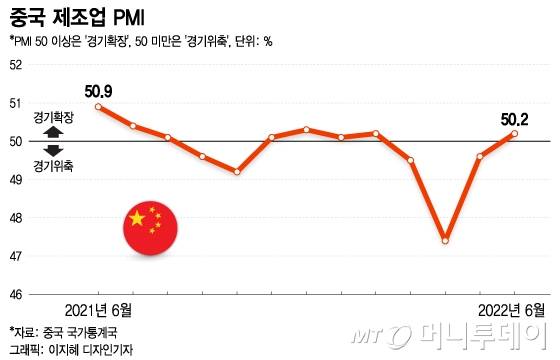 6월 제조업 PMI는 50.2로 전월(49.6) 대비 0.6포인트 상승했다. 상하이의 코로나19 봉쇄가 정점에 달했던 지난 4월 PMI는 47.2로, 코로나19 팬데믹의 시발점인 우한 사태 발생 당시인 2020년 2월 이후 26개월 만의 최저치를 기록했었다. 그러다 상하이 봉쇄가 단계적으로 해제되고 주요 기업들의 조업이 재개되면서 제조업 PMI는 지난달부터 반등하기 시작했고, 이달에는 기준선 50을 넘어섰다.