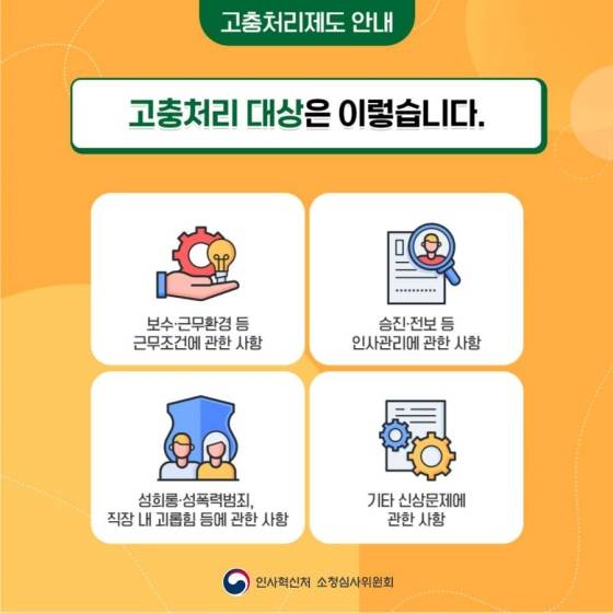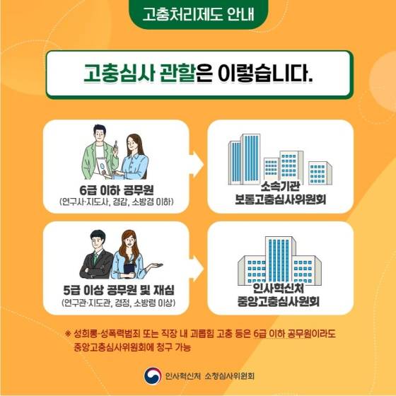 ㆍ 보수·근무 환경 등 근무조건에 관한 사항 ㆍ 승진·전보 등 인사관리에 관한 사항 ㆍ 성희롱·성폭력 범죄, 직장 내 괴롭힘 등에 관한 사항 ㆍ 기타 신상 문제에 관한 사항 ◆ 고충심사 관할은 이렇습니다 ㆍ 6급 이하 공무원 (연구사·지도사, 경감, 소방경 이하) → 소속기관 보통 고충 심사위원회 ㆍ 5급 이상 공무원 및 재심 (연구관·지도관, 경정, 소방령 이상) → 인사혁신처 중앙 고충 심사위원회 ※ 성희롱·성폭력 범죄 또는 직장 내 괴롭힘 고충 등은 6급 이하 공무원이라도 중앙 고충 심사위원회에 청구 가능 ◆ 2022년 1월 25일부터 고충 심사 제도가 이렇게 바뀌었습니다.