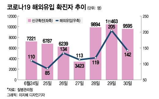 특히 해외유입 신규 확진자 수가 142명으로 5일째 세 자릿 수를 기록했다. 해외유입 확진자는 3월 11일(106명) 이후 96일 만인 지난 15일 104명으로 100명대를 기록했다. 이후 지난 22일 102명을 기록한 뒤 24일 110명, 25일 85명, 26일 134명, 27일 114명, 28일 119명, 29일 205명, 이날 142명까지 최근 일주일간 하루 빼고 세 자릿수를 이어갔다.
