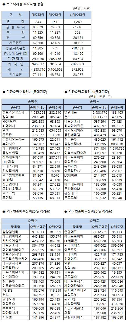 [표]코스닥 기관/외국인 매매동향(6/30 3시30분)