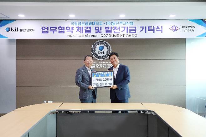 협약식에 이어 ㈜일진전자산업이 인재 양성을 위한 대학 발전기금 2000만 원을 금오공대에 기부했다.