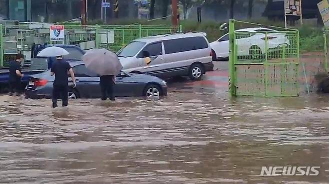 [인천=뉴시스] 이루비 기자 = 30일 오후 인천 서구 안동포사거리 인근 저지대가 침수돼 차량 등이 물에 잠겼다. 기상청에 따르면 전날 오후 3시부터 이날 오전 11시까지 인천지역에 누적 100.4㎜의 폭우가 쏟아졌다. 2022.06.30. ruby@newsis.com