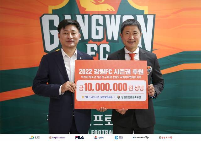 강원은 30일 사무국에서 이영표 강원 대표이사와 고명환 NH농협은행 강원영업본부장이 참석한 가운데 시즌권 후원식을 가졌다. NH농협은행 강원영업본부에선 강원도 내 청소년과 어린이들이 경기를 관람할 수 있도록 '춘천 홈경기 시즌권'을 구매하며 강원의 남은 시즌을 응원하겠다는 뜻을 전했다.