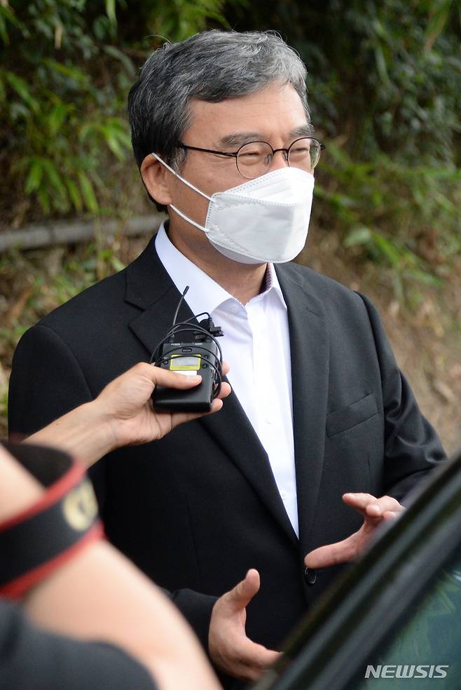 [전주=뉴시스] 김얼 기자 = 이스타항공 자금 배임·횡령으로 전주교도소에 수감됐었던 이상직 전 의원이 30일 전북 전주시 전주교도소에서 보석으로 석방돼 기자들의 질의에 답변하고 있다. 2022.06.30. pmkeul@newsis.com