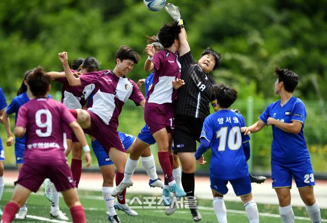 대전 한빛고 골키퍼 최연우가 30일 삼척 동해지방해양경찰수련원에서 열린 제30회 여왕기 전국여자축구대회 고등부 8강전 충주예성여고와 경기에서 볼을 막아내고 있다.