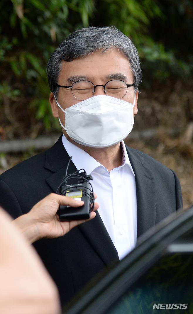 [전주=뉴시스] 김얼 기자 = 이스타항공 자금 배임·횡령으로 전주교도소에 수감됐었던 이상직 전 의원이 30일 전북 전주시 전주교도소에서 보석으로 석방돼 기자들의 질의에 답변하고 있다. 2022.06.30. pmkeul@newsis.com