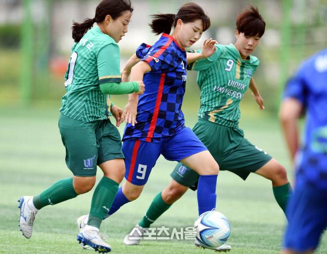 동원대 윤수정(가운데)이 30일 삼척복합체육공원에서 열린 제30회 여왕기 전국여자축구대회 위덕대와 경기에서 드리블을 하고 있다.