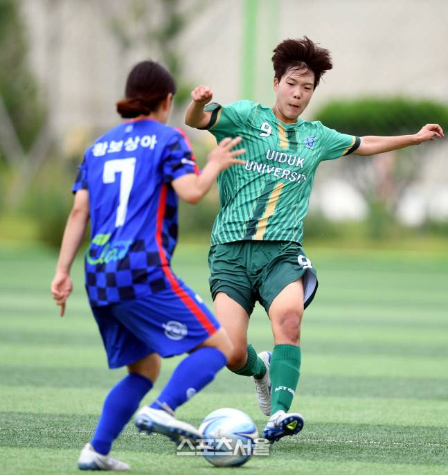위덕대 이진(오른쪽)이 30일 삼척복합체육공원에서 열린 제30회 여왕기 전국여자축구대회 동원대와 경기에서 상대 공격을 막아내고 있다.