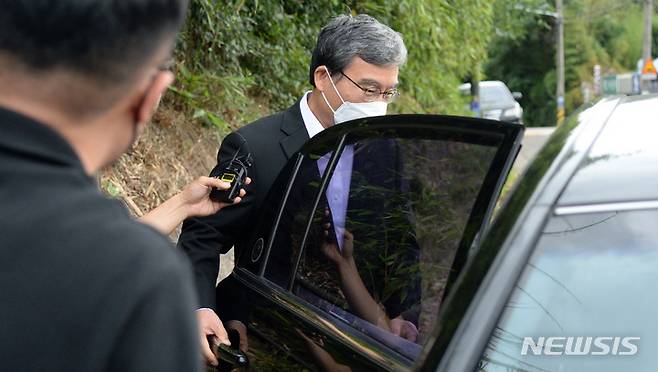 [전주=뉴시스] 김얼 기자 = 이스타항공 자금 배임·횡령으로 전주교도소에 수감됐었던 이상직 전 의원이 30일 전북 전주시 전주교도소에서 보석으로 석방돼 장내를 빠져나오고 있다. 2022.06.30. pmkeul@newsis.com
