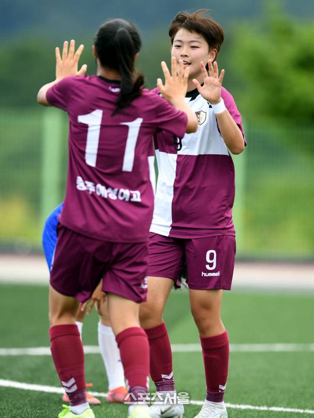 충주예성여고 홍채빈(오른쪽)이 30일 삼척 동해지방해양경찰수련원에서 열린 제30회 여왕기 전국여자축구대회 고등부 8강전 대전 한빛고와 경기에서 골을 넣은 후 환호하고 있다.