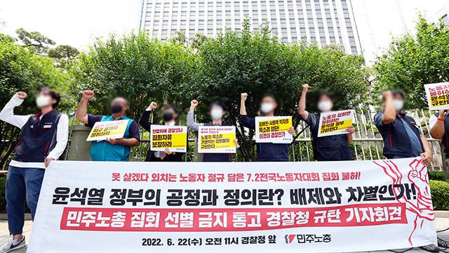 윤희근 경찰청 차장은 “민주노총은 서울 도심권에서 수만 명의 대규모 인원이 참석하는 집회와 행진을 예고하고 있다”면서 “신고범위를 일탈하거나 법원의 허용 조건을 벗어난 불법 집회와 행진에 대해서는 가용 경력과 장비를 총동원하여 엄정하게 대응할 방침”이라고 말했습니다.