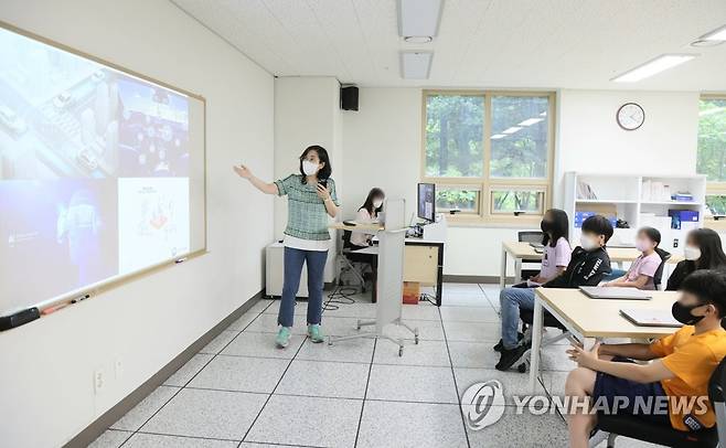 (서울=연합뉴스) 김현숙 여성가족부 장관이 30일 경기도 분당야탑 청소년방과후아카데미를 방문, 일일 교사가 되어 청소년들에게 수업하고 있다. 2022.6.30 [여성가족부 제공. 재판매 및 DB 금지]