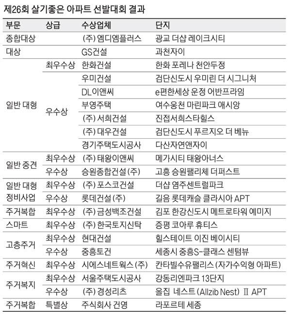 주거복합 부문의 김포 한강신도시 메트로타워 예미지(금성백조건설)는 그래픽 아트월과 경관 조명 등으로 높은 점수를 받았으며, 스마트 주거 부문의 증평 코아루 휴티스(한국토지신탁)도 튀지 않는 단정한 설계와 깔끔한 공사 마무리 등이 훌륭했다는 평가를 받았다.