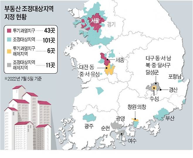 수도권에선 아파트가 없음에도 해당 시·군·구가 일괄 지정되는 바람에 피해를 본 경기 안산시 단원구 대부동동·대부남동·대부북동·선감동·풍도동과 인근 화성시 서신면(제부도) 등을 규제지역에서 해제했다. 이날 결정으로 투기과열지구는 49곳에서 43곳으로, 조정대상지역은 112곳에서 101곳으로 축소됐다. 국토부 관계자는 “수도권의 경우 다수 지역에서 집값 상승세가 지속되고 있거나 하락으로 전환된 지 얼마 되지 않아 당분간 규제지역을 유지하고 시장 상황을 볼 방침”이라고 말했다.